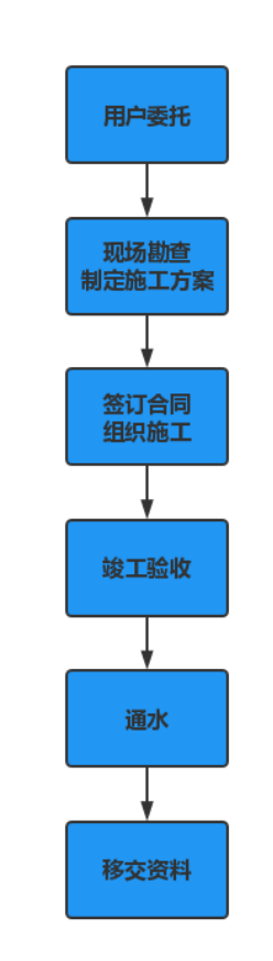 二、用戶(hù)委托---建設(shè)工程有限公司現(xiàn)場(chǎng)踏勘---供水施工方案---簽訂合同---建設(shè)工程有限公司組織安全文明施工---竣工第三方驗(yàn)收---通水---移交(供水設(shè)施及技術(shù)檔案)